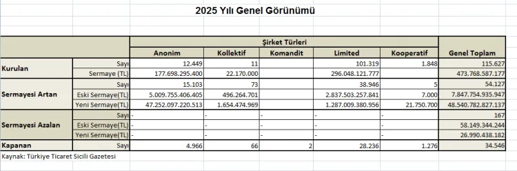 2025 yılı boyunca kapanan şirket sayısı yüzde 5,9 artarken, kooperatifler yüzde 6,4 oranında daha fazla kapandı.