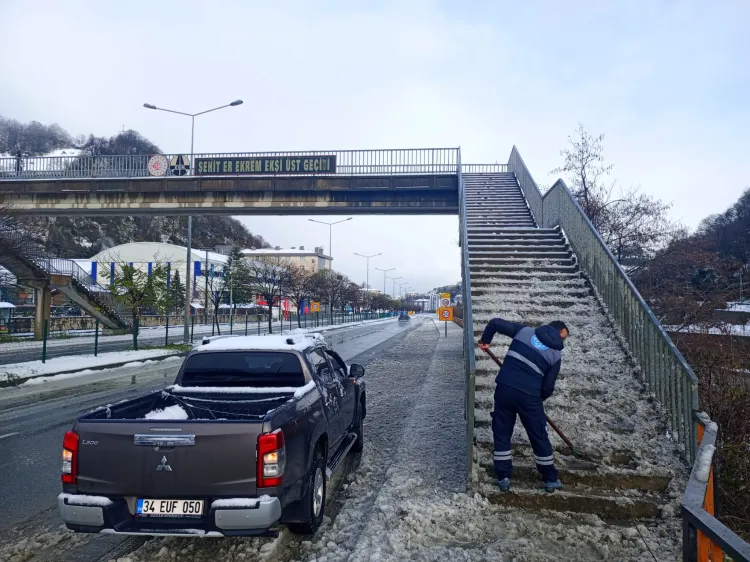 Trabzon'da gece saatlerinde etkili olan kar yağışının ardından Trabzon Büyükşehir Belediyesi ekipleri, şehir merkezinde geniş çaplı kar temizleme çalışması başlattı.