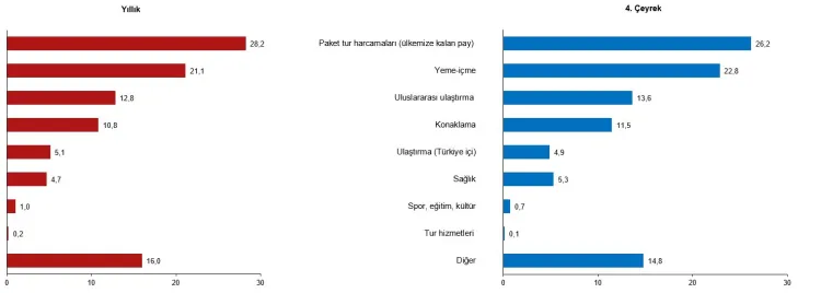 IV. çeyrekte ise paket tur harcamalarının payı yüzde 26,2, yeme-içme harcamalarının payı yüzde 22,8 olarak gerçekleşti.