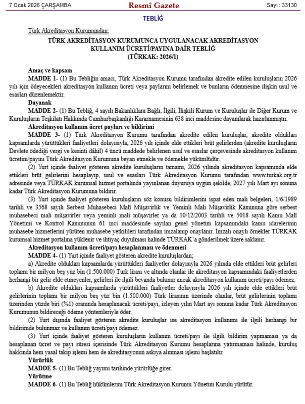 ANKARA (İGFA) - Türk Akreditasyon Kurumu tarafından hazırlanan "Türk Akreditasyon Kurumunca Uygulanacak Akreditasyon Kullanım Ücreti/Payına Dair Tebliğ, bugünkü Resmi Gazete'de yayımlanarak yürürlüğe girdi. Tebliğ ile, TÜRKAK tarafından akredite edilen kuruluşların 2026 yılı boyunca akreditasyon kapsamındaki faaliyetlerinden elde ettikleri gelirler üzerinden ödeyecekleri kullanım ücreti ve paylarına ilişkin esaslar düzenlendi.