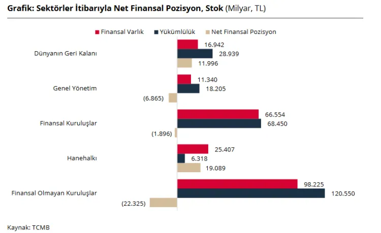 Rapora göre, dönem sonu itibarıyla yurt içi yerleşik sektörlerin toplam finansal varlıkları 202 trilyon TL, yükümlülükleri ise 214 trilyon TL olarak gerçekleşti. Veriler, Türkiye ekonomisinin net finansal pozisyon açığının bir önceki çeyreğe göre 1,9 puan azalarak gayri safi yurt içi hasılaya (GSYİH) oranla yüzde 20,8 seviyesine gerilediğini ortaya koydu.