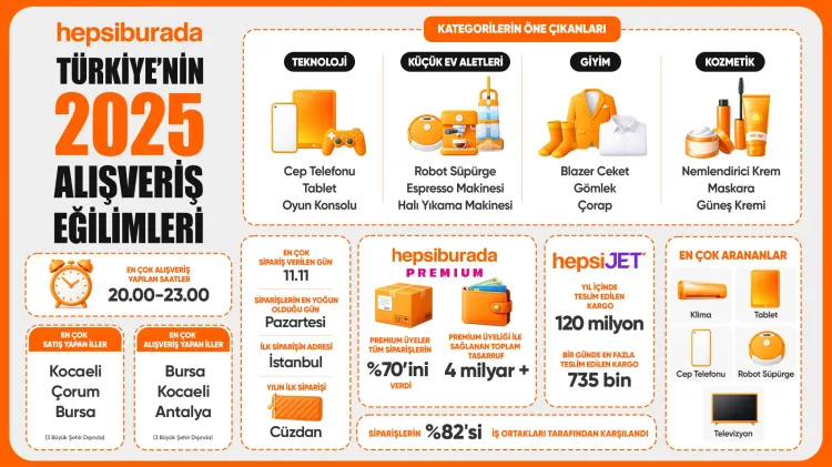 İSTANBUL (İGFA) - Hepsiburada, 2025 yılı boyunca platformda verilen milyonlarca siparişi analiz ederek Türkiye'nin alışveriş alışkanlıklarını gözler önüne seren kapsamlı veriler paylaştı. Yıl genelinde teknoloji kategorisinde cep telefonu, tablet ve oyun konsolları en çok tercih edilen ürünler arasında yer aldı.