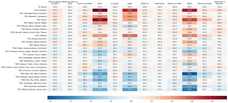 Konut harcamalarında İstanbul 147,3 endeks değeriyle açık ara en pahalı bölge oldu. Aynı şekilde eğitim (138,8), sağlık (136,8), ulaştırma ve çeşitli mal ve hizmetler gruplarında da en yüksek fiyat düzeyleri İstanbul'da ölçüldü. Bu gruplarda en düşük fiyat düzeyleri ağırlıklı olarak TRA2 ve TRC3 bölgelerinde görüldü.