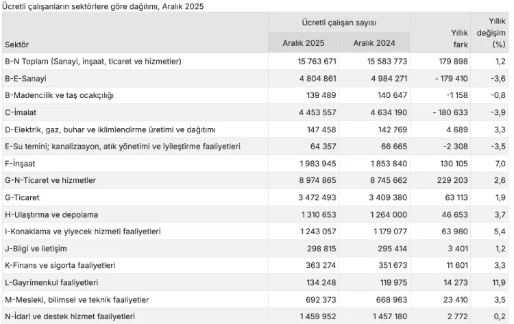 TÜİK verilerine göre, sanayi, inşaat ve ticaret-hizmet sektörleri toplamında ücretli çalışan sayısı 2025 Aralık ayında yıllık bazda yüzde 1,2 artarak 15 milyon 763 bin 671 kişiye yükseldi. Aylık artış ise yüzde 0,1 oldu.