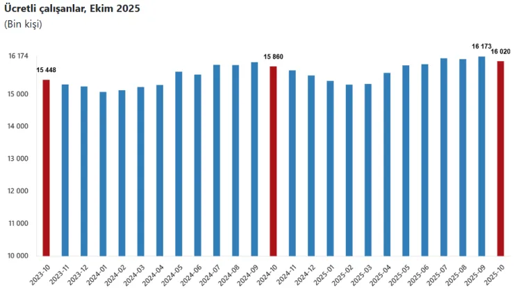 Türkiye İstatistik Kurumu (TÜİK) verilerine göre, sanayi, inşaat ve ticaret-hizmet sektörleri toplamında ücretli çalışan sayısı 2025 Ekim ayında bir önceki yılın aynı ayına göre yüzde 1 arttı. Geçen yıl aynı dönemde 15 milyon 860 bin 31 olan ücretli çalışan sayısı, bu yıl 16 milyon 20 bin 394'e yükseldi.
