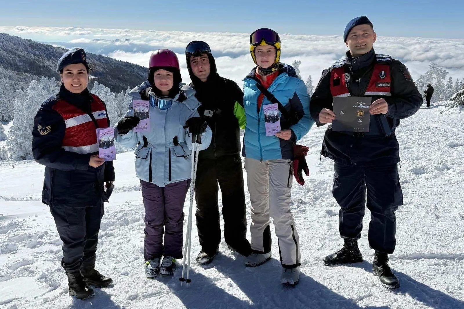 Bursa İl Jandarma Komutanlığı, Uludağ Milli Parkı'nda kış turizmi için bulunan vatandaşlara Kadın Acil Destek Uygulaması (KADES) hakkında bilgilendirme çalışması gerçekleştirdi.