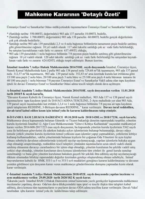 İstanbul'da Ümraniye Esnaf ve Sanatkârlar Odası'na ait taşınmazların önceki yönetim tarafından usulsüz şekilde bir vakfa devredilmesine ilişkin açılan tapu iptal ve tescil davası, tüm yargı aşamalarında oda lehine sonuçlandı. Yaklaşık 500 milyon TL değerindeki taşınmazlar yeniden esnafın oldu.