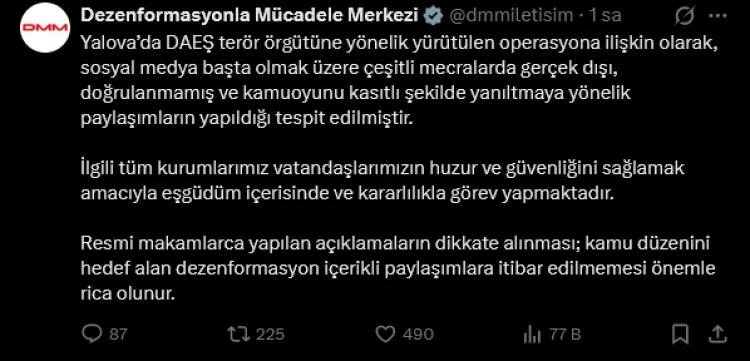 Öte yandan Dezenformasyonla Mücadele Merkezi (DMM) de yazılı bir açıklama yaparak, Yalova'daki operasyonla ilgili sosyal medya başta olmak üzere çeşitli mecralarda gerçek dışı ve doğrulanmamış paylaşımlar yapıldığını bildirdi. Açıklamada, vatandaşların resmî makamların açıklamalarını dikkate alması ve kamu düzenini hedef alan dezenformasyon içeriklerine itibar etmemesi gerektiği vurgulandı.