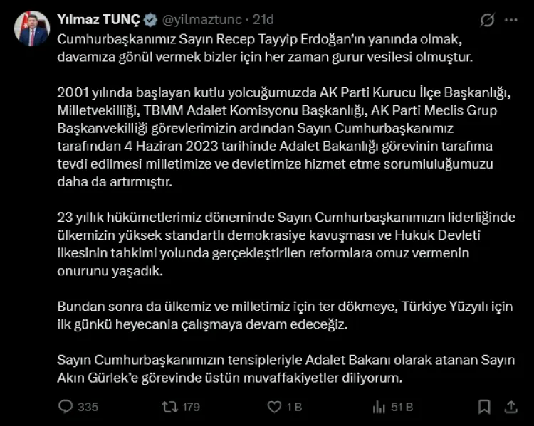 Yine Resmi Gazete'deki aynı kararname ile Adalet Bakanlığı görevinden ayrılan Yılmaz Tunç ise açıklamasında, Cumhurbaşkanı Erdoğan'la yürütülen siyasi mücadelenin kendileri için her zaman bir gurur kaynağı olduğunu vurguladı. AK Parti'de üstlendiği çeşitli görevlerin ardından 4 Haziran 2023'te Adalet Bakanlığı görevine getirildiğini hatırlatan Tunç, bu süreci millet ve devlet hizmeti açısından büyük bir sorumluluk olarak gördüğünü ifade etti.