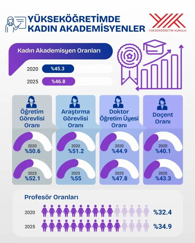 Akademik kadrolarda da artışın sürdüğünü kaydeden Prof. Dr. Özvar, 2020'de yüzde 45,3 olan kadın akademisyen oranının 2025'te yüzde 46,8'e, araştırma görevlilerinde ise yüzde 55'e ulaştığını açıkladı.