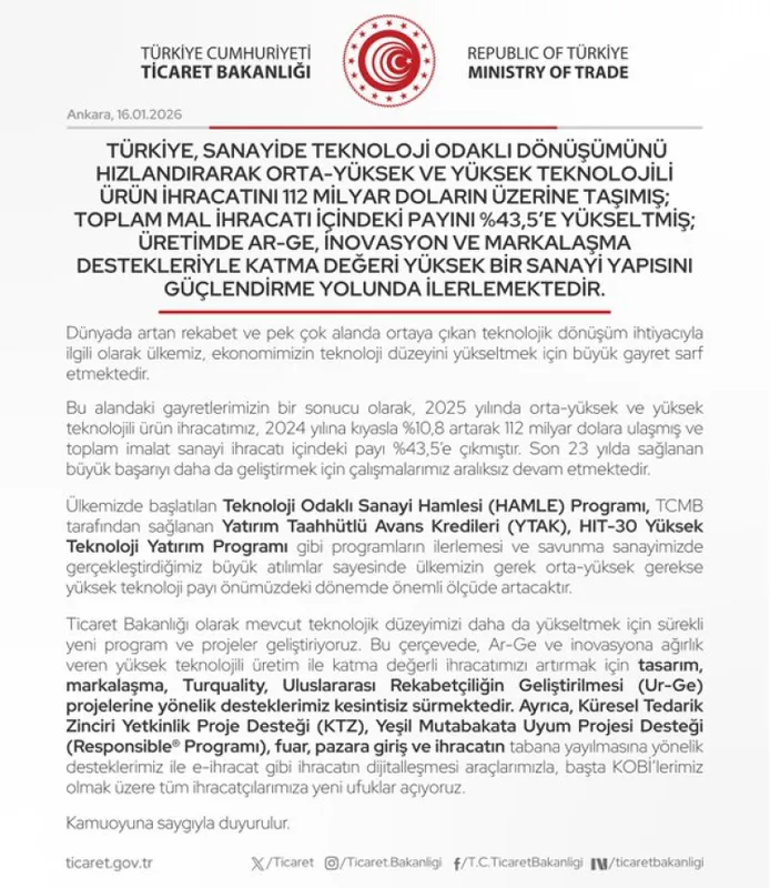 Açıklamada, söz konusu destek mekanizmalarıyla Türkiye'nin yüksek katma değerli ve teknoloji odaklı ihracatının önümüzdeki dönemde daha da artacağı vurgulandı.