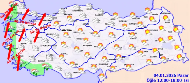 Sabah ve gece saatlerinde iç ve doğu kesimlerde buzlanma, don, pus ve sis etkili olacak. Hava sıcaklıkları kuzey, iç ve batı bölgelerde artarak normallerin üzerine çıkması bekleniyor. Rüzgârın ise Marmara, Ege ve Batı Karadeniz'de güneyli yönlerden kuvvetli ve yer yer fırtına şeklinde (40-70 km/sa) esmesi öngörülüyor.