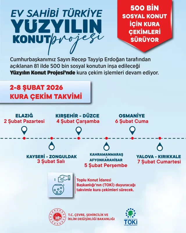 Yeni haftada 10 il için kura heyecanının başlayacağını belirten Bakan Kurum, 2–8 Şubat tarihlerinde gerçekleştirilecek çekimlerin takvimini vatandaşlarla paylaştı.