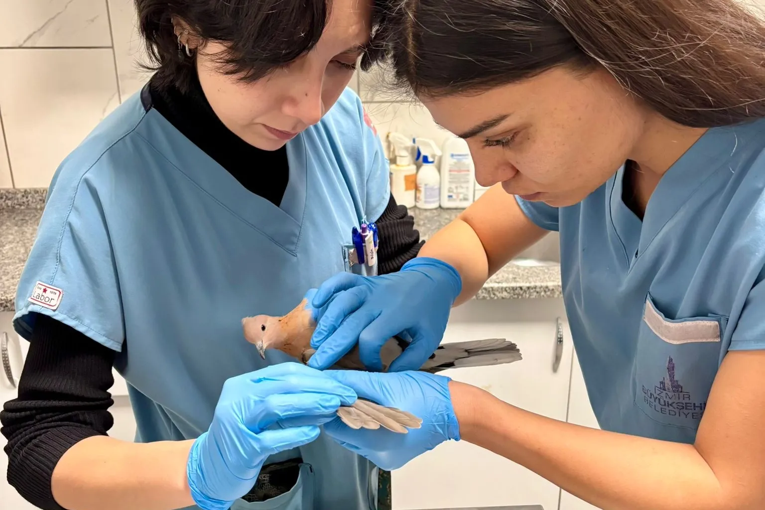 Zor günlerde dayanışmayı büyüten İzmir Büyükşehir Belediyesi ekipleri, yağmurun altında umudu ayakta tutmaya devam ediyor. Bu anlayışın bir başka örneği ise İzmir Büyükşehir Belediyesi Zabıta Dairesi Başkanlığı ekiplerinin yaralı halde bulduğu yaban güvercininde görüldü. Ekipler, yaralı güvercine hassasiyetle yaklaşarak, onu Veteriner İşleri Dairesi Başkanlığı Hayvan Sağlığı Şube Müdürlüğü’ne bağlı Kültürpark Küçük Hayvan Polikliniği’ne getirdi. Veteriner hekimler, güvercine hemen müdahale etti.